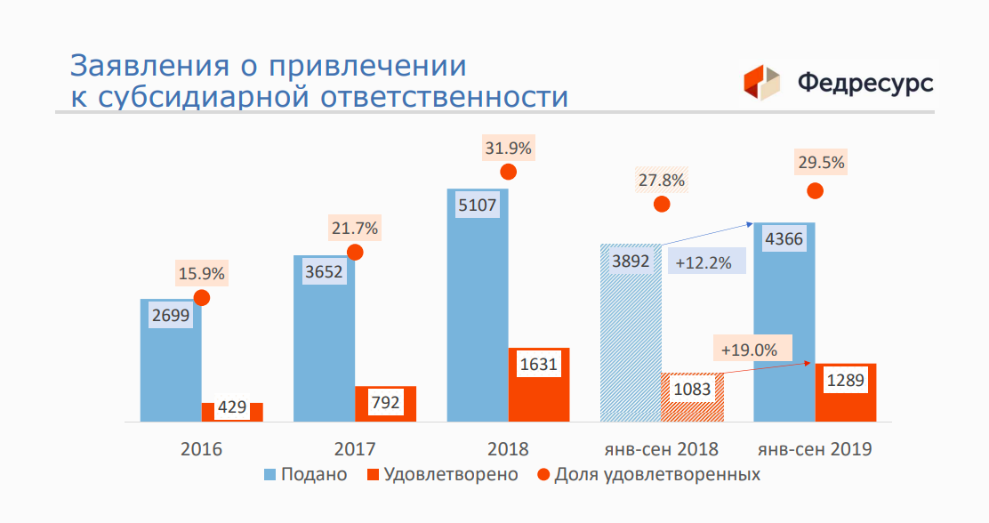 При этом количество заявлений о привлечении к субсидиарной ответственности за неполные 4 года (01.01.2016-30.09.2019) составляет 15824 шт., причем их количество ежегодно растет в среднем на 25-30% в год. Более четверти всех заявлений (4141 шт.) было удовлетворено в пользу кредиторов на общую сумму 807,2 млрд. руб. Полные данные о статистике привлечения к субсидиарной ответственности приведены в презентации “Процедуры банкротства: статистика Федресурса”.